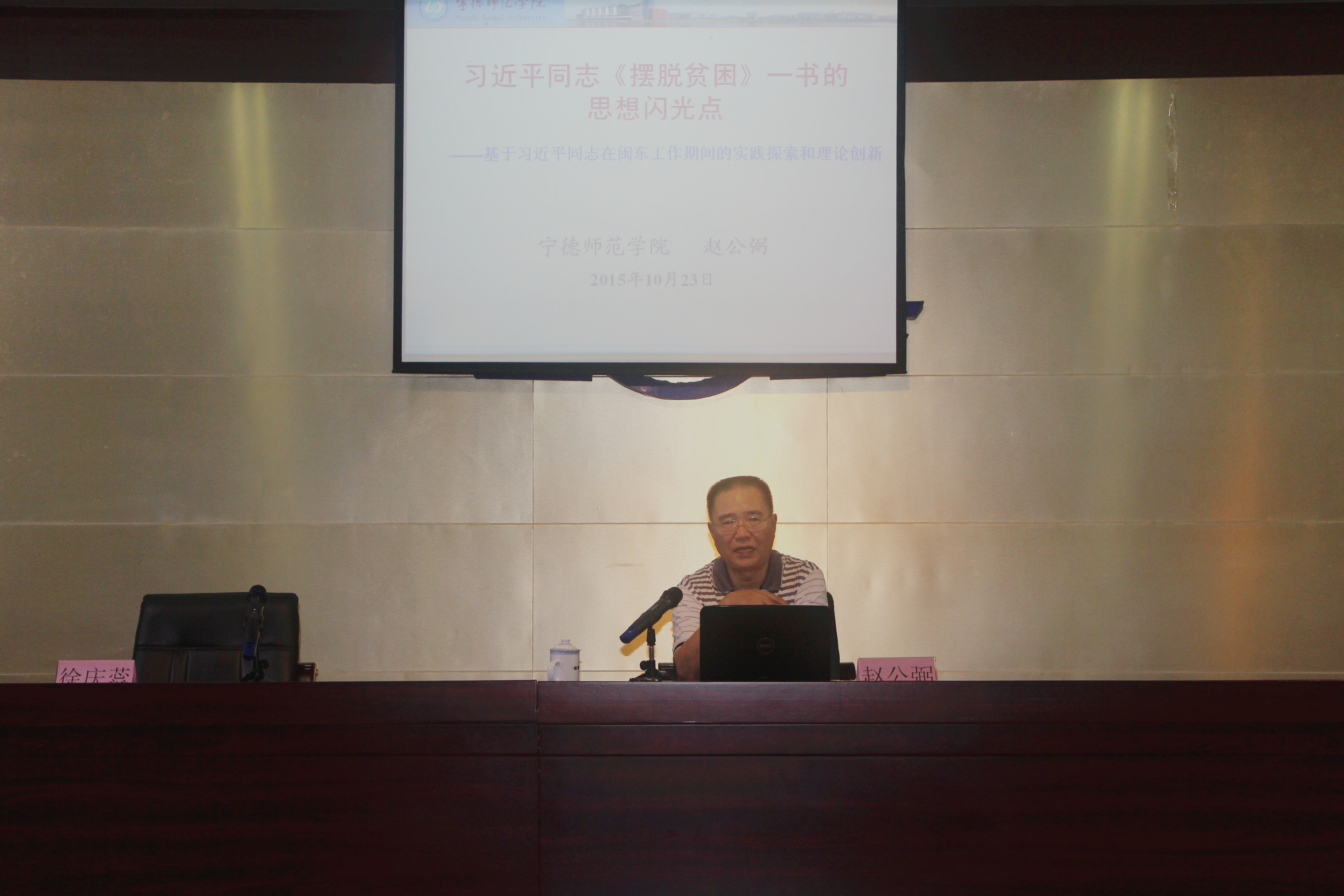赵公弼部长结合习近平总书记在当前新形势下改革发展稳定、内政外交国防、治国治党治军方面的施政方略,以“习近平同志《摆脱贫困》一书的思想闪光点”为主题,紧紧围绕习总书记“心系群众”的爱民情怀、“摆脱贫困”的主政方略、“弱鸟先飞”的奋进意识、“滴水穿石”的坚韧意志、“四下基层”的优良作风、“矢志不渝”的追梦精神、“抓铁有痕”的反腐决心、“从严抓实”的党建思想、“唯物辩证”的思维方式等九个方面,讲述“全面建成小康社会、全面深化改革、全面依法治国、全面从严治党”的治国理政思想,指出习总书记治国理政思想的方方面面源于他早期学习、工作、实践,离不开他在宁德工作期间的实践探索与理论创新。
